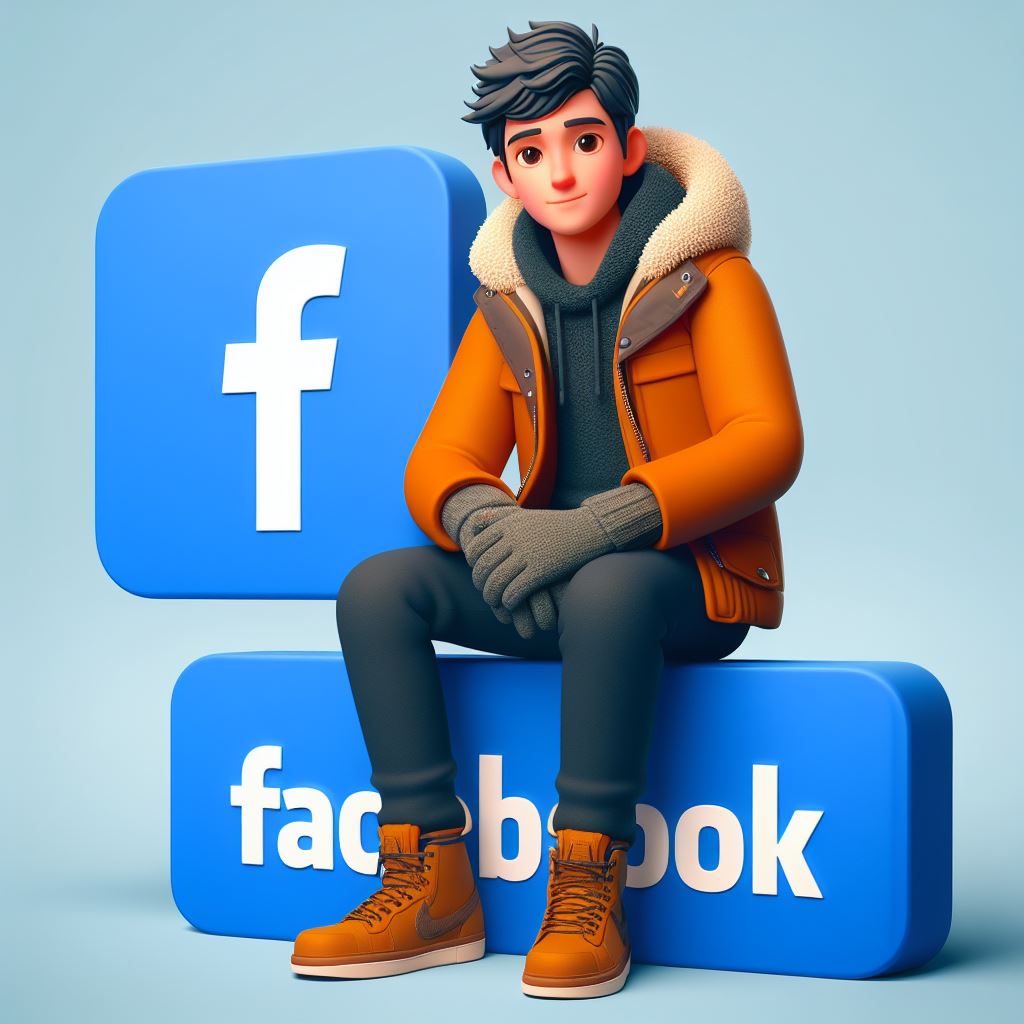 قم بانشاء رسم توضيحى ثلاثى الأبعاد يضم شاب يرتدي جاكيت برتقالى وبنطلون جينز ازرق واقعي والجلوس بشكل عرضى مع لابتوب ماركة أبل, والخلفية تكون صفحة المستخدم لدى وسائل التواصل الإجتماعي تحديدا ” فيسبوك” مع اسم المستخدم يكون ” kashkolonline ” وصورة البروفايل متناسقة